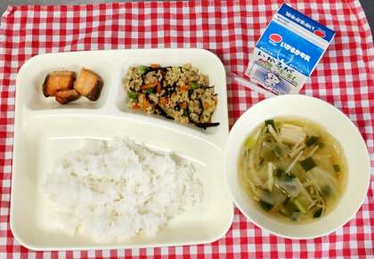 今日は、さけのしょうゆ風味焼き、五目汁、高野どうふのいり煮、ごはん、牛乳でした。鮭は秋が旬です。体をつくるタンパク質のほか、血液の流れをよくする成分も多く含まれています。高野豆腐は粉末を使いました。良質のたんぱく質やカルシウムなどが豊富なのでご家庭でもおすすめの食材です。