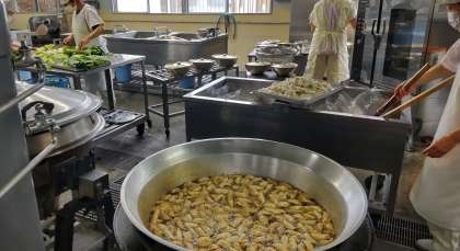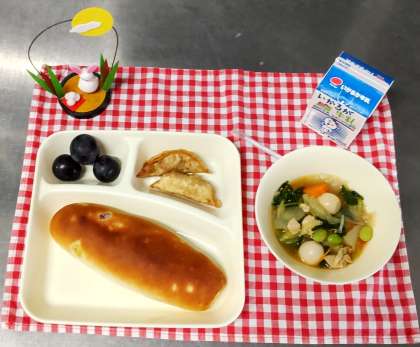 今日は、揚げぎょうざ、中華煮、ぶどう(巨峰)、おさつパン、牛乳でした。鶏肉やたくさんの野菜が入った中華煮はうずら卵が入ったものと卵除去食のふたつを用意しました。ぎょうざは揚げるとパリッとしていつもと違う触感が楽しめますよ。