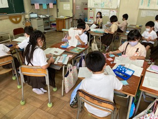 野菜作りの手順やこつを1年生に教えてあげるために、説明文を書いています。友達と見合って、良いところや改善点などをアドバイスしました。野菜を一生懸命育てたので、育てるポイントやなぜそうした方が良いのかなども書いています。