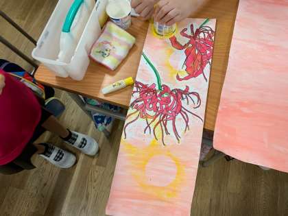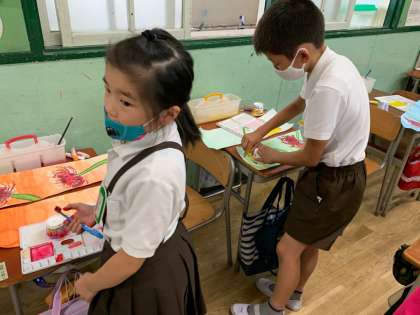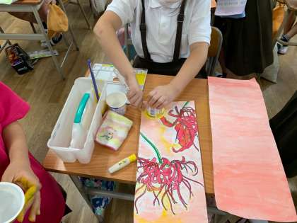 歯ブラシで絵の具を弾いていくのでずが、なかなか難しいと苦戦していました。
