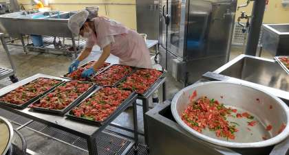 今日は、牛肉の香味焼き、スープ煮、サワーキャベツ、コッペパン、いちごジャム、牛乳でした。牛肉は、ワイン、塩、こしょう、オールスパイス、ウスターソース、オリーブ油で丁寧に下味をつけてピーマンと合わせて蒸し焼きにしました。ピーマンが苦手な子も良い香りとお肉が一緒で食べやすかったようです。
