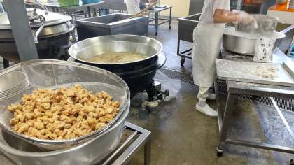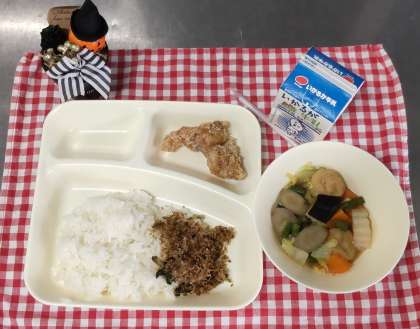今日は鶏肉のたつたあげ、一口がんもと野菜の煮物、おかか菜っぱ、ご飯、牛乳でした。給食では、ふりかけも手作りのものを用意します。けずりぶしと大根葉で作るカルシウムたっぷりのおかか菜っぱはご飯が進みます。竜田揚げも丁寧に衣をつけて揚げてくれました。