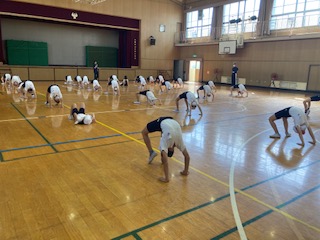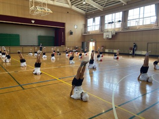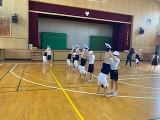 運動会の団体競技の前に、少しだけ倒立やブリッジなどを披露します。1学期から学習してきた技です。