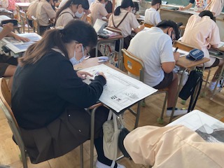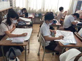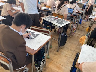 風景など、切り絵の下絵を描いています。高学年らしい細かい表現や、黒と白のコントラストをよく考えた構成になっています。
