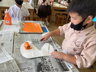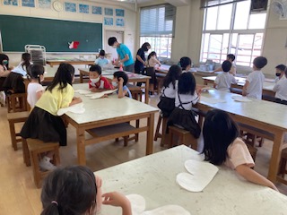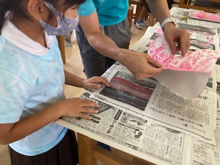 紙で作った版画に色インクをつけて擦りました。半分に折った紙を広げると、反対側に写し出されたもようが出て、すてきなチョウになりました!