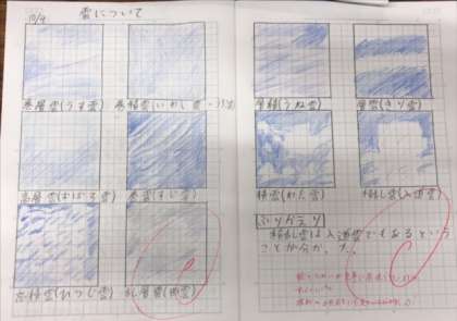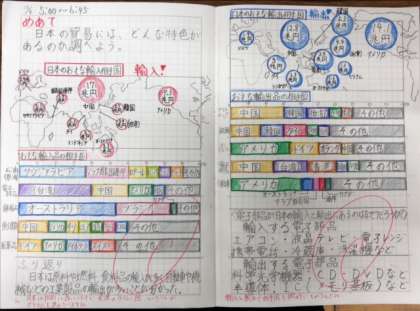 理科で習った雲の種類を図でまとめた自学、家庭科で学習した製品のマークについて発展的に学習してくる自学、社会科でこれから学習する日本の貿易についてグラフや表をていねいにかき写し、その特徴について考えた自学などさまざまです。