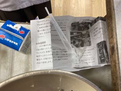 1年生の子どもが、給食のストローを捨てるビニル袋に替えて、不要になった紙で作ったごみ用の入れ物を持ってきてくれました!