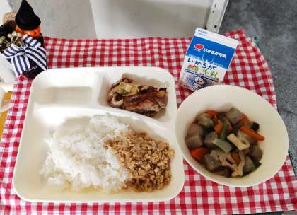 今日は豚肉のねぎじょうゆ焼き、ふきよせ煮、ツナ大豆そぼろ、ご飯、牛乳でした。