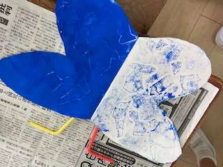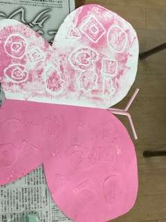 この前、版画で模様をかいたちょうちょにストローで触角をつけました。かわいいちょうちょの出来上がり!