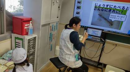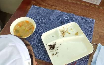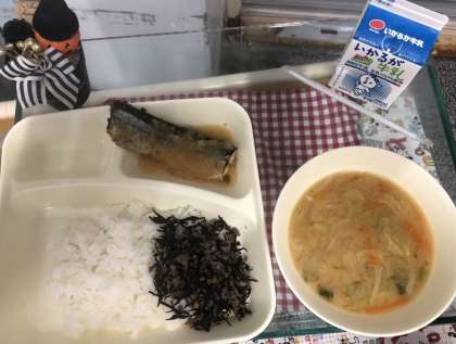 今日はさんまのみぞれかけ、みそ汁、牛ひじきそぼろ、ご飯、牛乳でした。秋に美味しくなる刀のように細い魚という意味で秋刀魚と書きます。太い背骨やたくさんの小骨を上手によけながら、秋の味覚にチャレンジしていました。