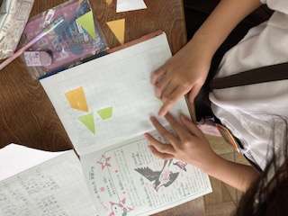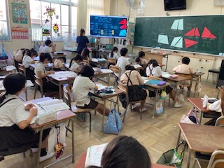 三角形や四角形を直線で切り取ると、どんな形になるか試してみました。三角形と四角形、三角形が二つ、四角形が二つなど、いろいろな切り方でできる形が変わるという発言をしました。