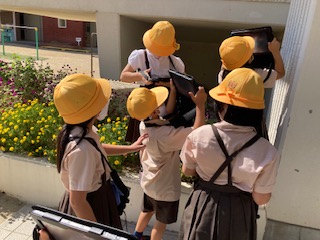 バッタなどの虫を探しにビオトープや学習園にいきました。見つけた虫をタブレットで写真を撮り、保存しました。