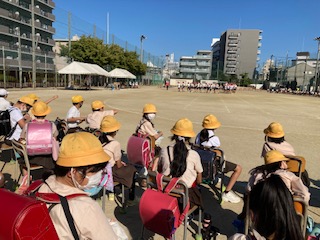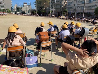 朝の運動会に備えて、全員が児童席に自分の椅子を運びました。