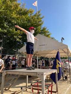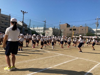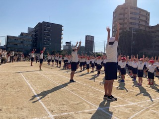 全員でラジオ体操をしました。運動委員会児童は、事前に何回も練習をしました。