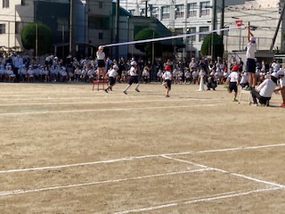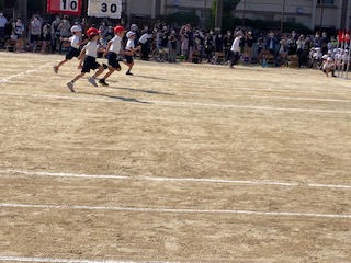 初めての運動会。緊張もあるけれど、応援してもらっている嬉しさでいっぱいの顔。元気に半周してスタートラインに。力一杯走り切りました!