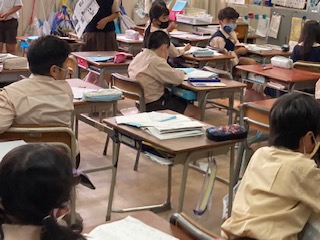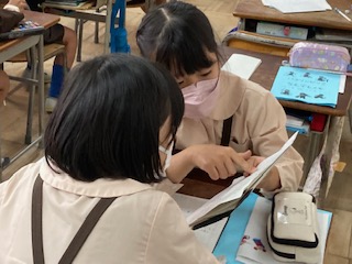 物語を作っています。友達と見せ合って、どう改善したら良いか意見を交流しています。