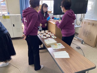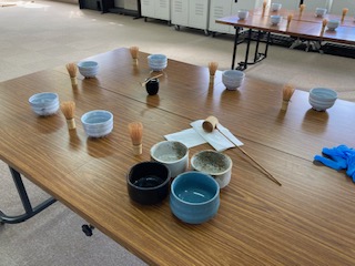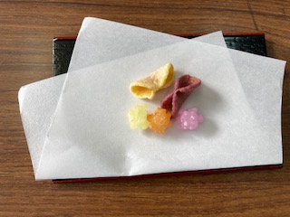 毎年、表千家 S先生に教えていただいています。お茶の道具なども準備してくださっています。お菓子は、吹き寄せと金平糖です。5年生の時、「和菓子を探る」(国語科)で学習したお菓子です。