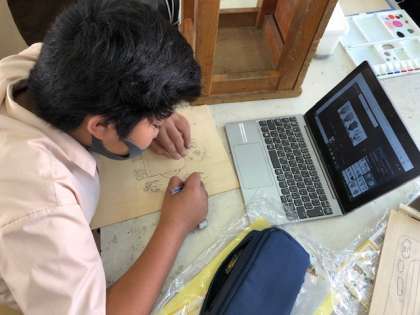 下絵を木の板にかき終えた子どもから、電動糸のこで周りを切り、色付けをしています。