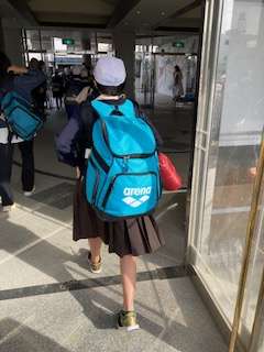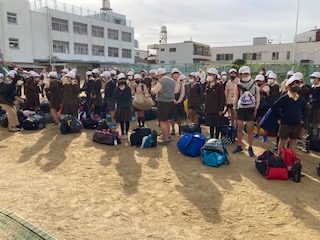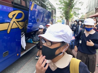 学校を出ました。3台のバスで行きます。元気で行ってきまーす!!