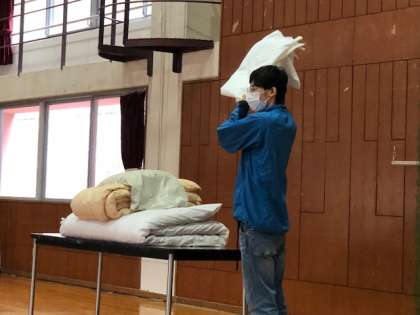布団の敷き方や畳み方についても説明を受けました。2日間、みんなで協力して楽しく過ごしましょう。