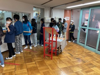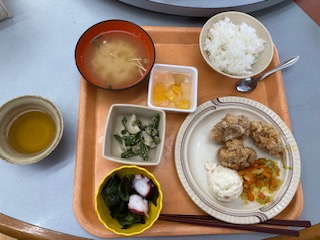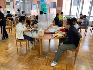 食事係が、ご飯や味噌汁などをよそいます。おかずなどは、トレーに入れてもらっているものを一人一人受け取って着席しました。