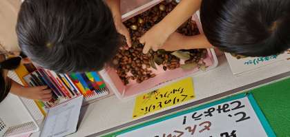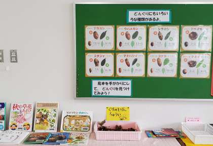 見て、触って、秋を楽しめるようにたくさんの種類のドングリを置いています。