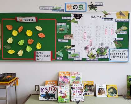 秋の虫やドングリの掲示をしています。