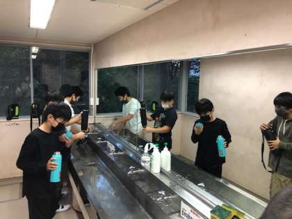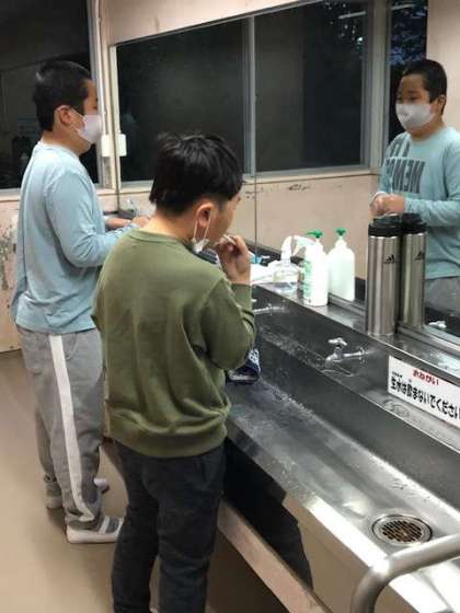 6時前に起床していた班が多く、着替えて洗面や布団たたみを自分たちでしています。