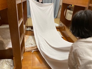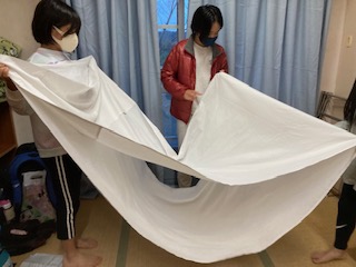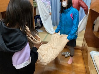 6時起床で部屋の布団などを片付けています。友達と協力しあったたんでいます。