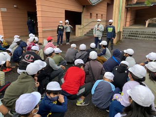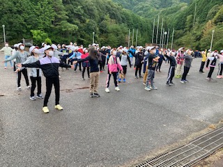 朝の集いを7時から広場で行いました。みんな元気です。小雨がほんのわずか降っていました。今日の目標を代表が発表しました。
