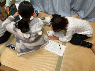 一日を振り返ってしおりに記入しています。班でまとめてリーダーはリーダー会議に。