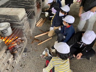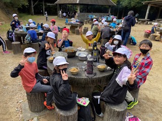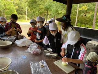 5年生になってまだ一度も家庭科で調理実習をしていません。包丁使いは勿論、火起こしの経験も昨年の校庭キャンプで少し体験しただけ。先生6人は、あちこちのグループに応援に入りましたが、忙しすぎてなかなか回ることができません。自分たちでやらなければいけないことがたくさんあり、それも良い経験となりました。にんじんやじゃがいもは小さく切ろう!!