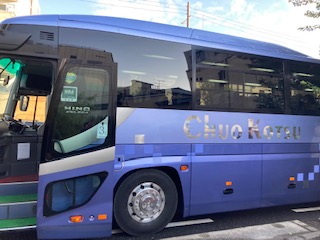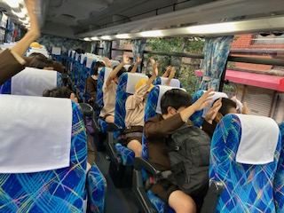 感染症対策で、3台のバスに分かれて乗車しています。元気で行ってきまーす!!
