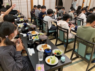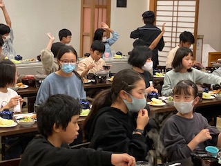 夕食タイムです。鉄火丼が苦手な子は、白ごはんと交換してもらっています。
