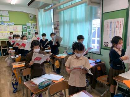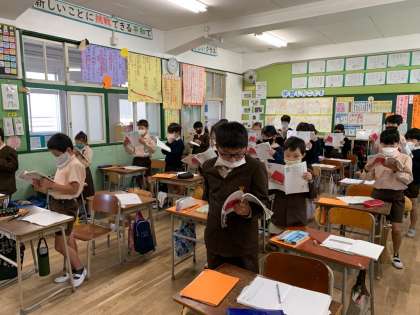 毎時間、国語の学習では内容理解を高めるため一斉読みか、一文読を取り入れています。