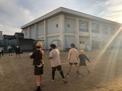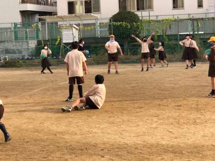 運動場で3年と5年が仲良くドッジボールやおにごっこをしていました。