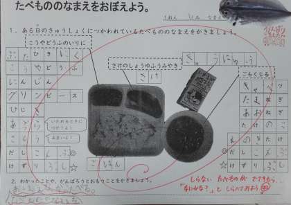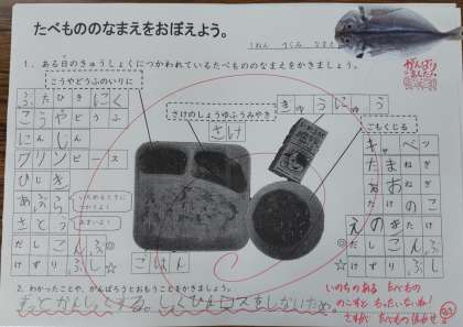 1年生で「たべもののなまえをおぼえよう」の学習をしました。食べ物クイズやある日の給食に登場する食べ物を知って食べ物博士になった子ども達は、食べる時に頑張ろうと思うことを考えました。