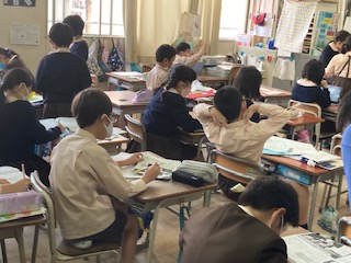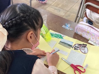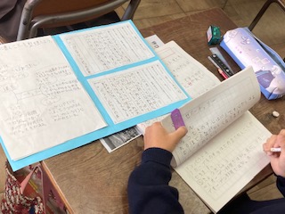 パラリンピックの競技について紹介するリーフレットを作っています。下書きメモをもとに、丁寧に書いています。
