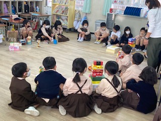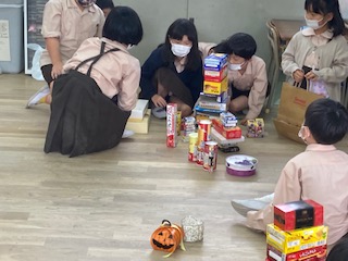 箱を似ている形で仲間分けをしました。どこが似ているか、理由も付け加えて発表しました。