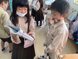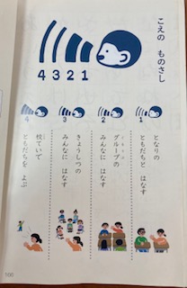 声のものさしを見ながら、どのくらいの声で話したら良いか考えました。そして、ペアで、落ち葉やどんぐりを使ってできた形を見て、何に見えるか話をしました。ペアの声の大きさで話せています。