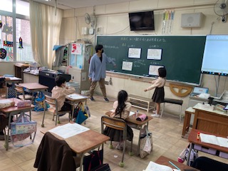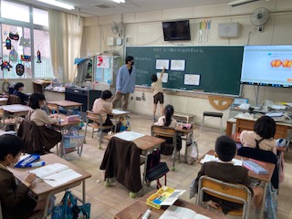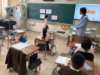 扇形の中に規則正しか並んだ星の数の数え方を考えました。かけ算を使って考えると速いことがわかっているので、どんなふうに考えると良いかいろいろ意見を出し合いました。