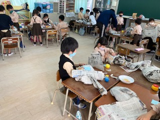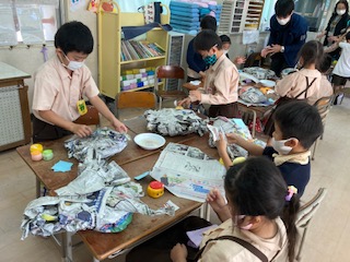 新聞紙を破ったり、丸めたりして動物の体を作っています。どんな動物ができるのかな。