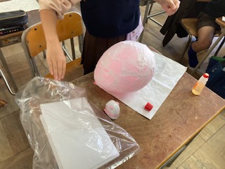 ゴム風船に半紙をのりで貼り付けています。張り子を作っています。