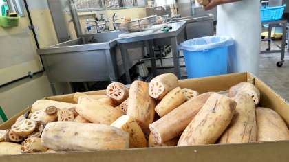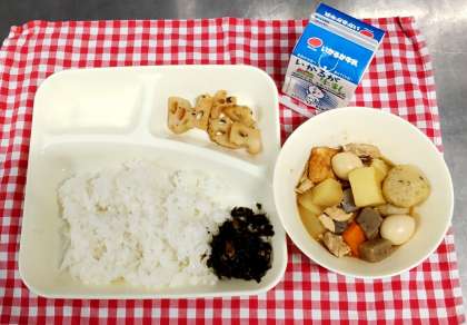今日は、関東煮、れんこんの梅風味焼き、のりの佃煮、ご飯、牛乳でした。関東煮はおでんのことです。うずら卵除去食も用意しました。たくさんの蓮根は今からが旬です。
