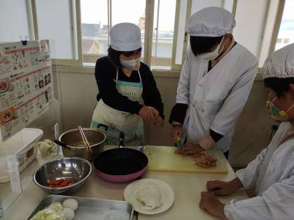 ベーコンポテト、野菜のベーコン巻き、豆腐と野菜のチャンプルーの3つの献立からグループごとに選び、調理実習を行いました。