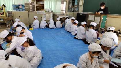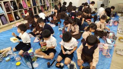 今日は、天候が思わしくなかったので、校外学習は延期になりました。 給食の時間は、楽しみにしていたお弁当を広げ、床に座って、遠足気分! 「もう一回お弁当が食べられるね!」「今度はどんなお弁当かな?」「次は、晴れるといいな。」など、うれしそうに味わっていました。