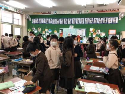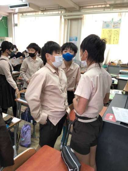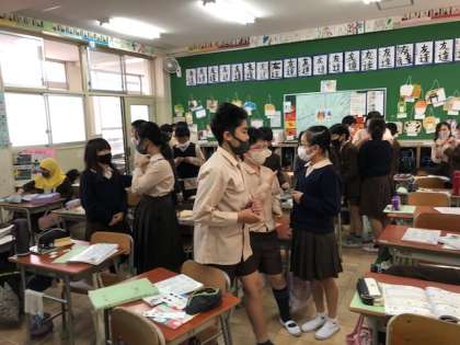 「I'd like ◯◯.」という表現を使って、好きな食べ物を伝え合っています。同じ食べ物を好きだったら、座れる…というようなゲームをして、繰り返し表現の練習をしています。