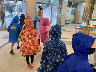 今日は2組が見学させてもらいました。出発時に雨が降り出し、カッパを着て学校を出ました。