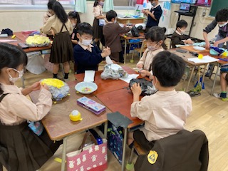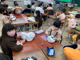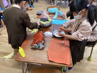 動物の顔や体を形作り、色画用紙をペタペタ貼っていきました。