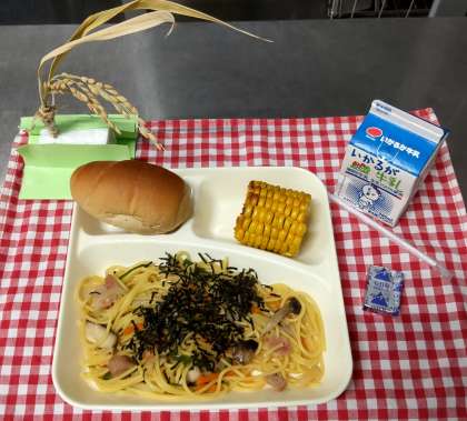 今日は、ウインナーときのこの和風スパゲッティ、焼きとうもろこし、固形チーズ、ミニ黒糖パン、牛乳でした。秋を感じさせるきのこの香りがするスパゲッティと子ども達に人気のとうもろこしを組み合わせました。